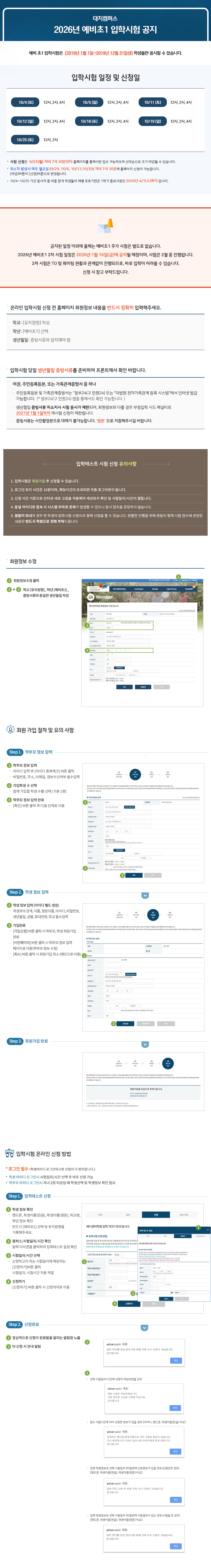 입학 TEST 안내 · 1차 지필 시험 후 합격생들은2차 인터뷰 진행 · 1차 - Vocabulary, Grammar, Reading, Writing · 2차 - 1:1 Interview 안내 일정 신청하기 신청/결과 조회 에디센어학원 입학 TEST 공지사항 입니다. 공지사항 대치캠퍼스 2026년 예비초1 입학테스트 안내 2025-09-08 목록